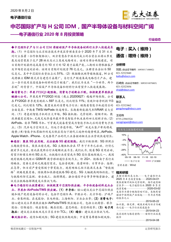 【光大证券】【20200802】电子通信行业2020年8月投资策略:中芯国际扩产与H公司IDM,国产半导体设备与材料空间广阔-45页