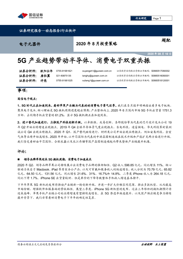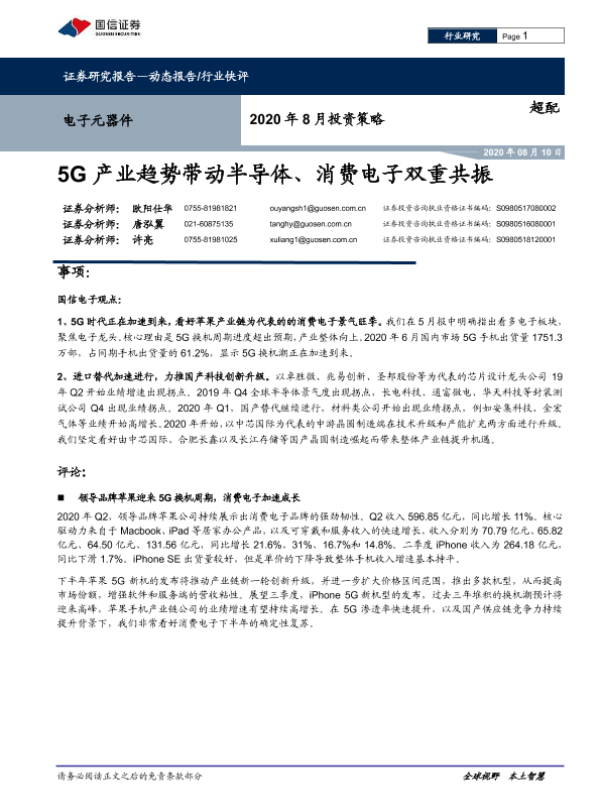 【国信证券】【20200810】电子元器件2020年8月投资策略:5G产业趋势带动半导体、消费电子双重共振-9页