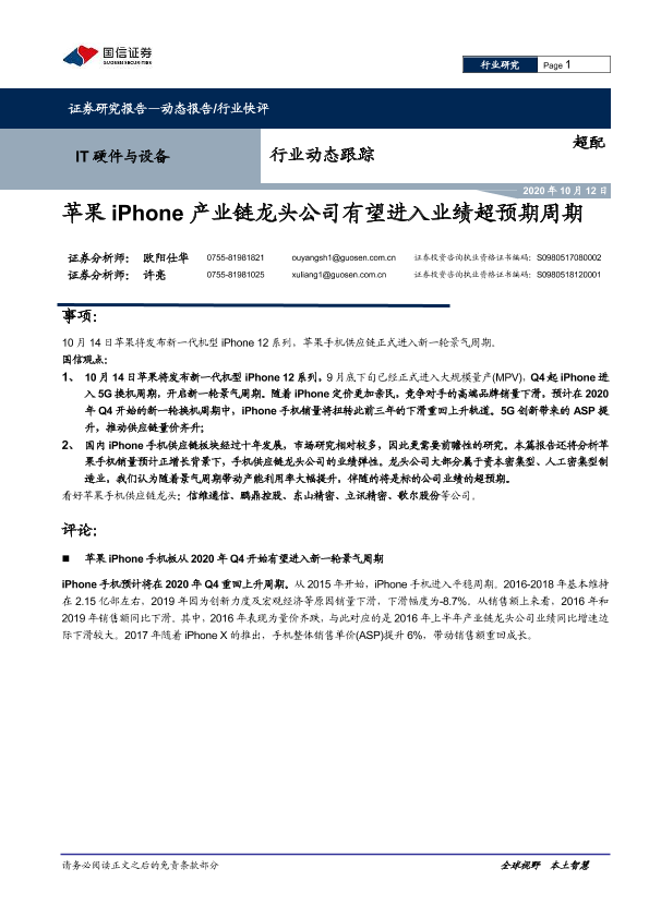 【国信证券】【20201012】IT硬件与设备行业动态跟踪:苹果iPhone产业链龙头公司有望进入业绩超预期周期-8页