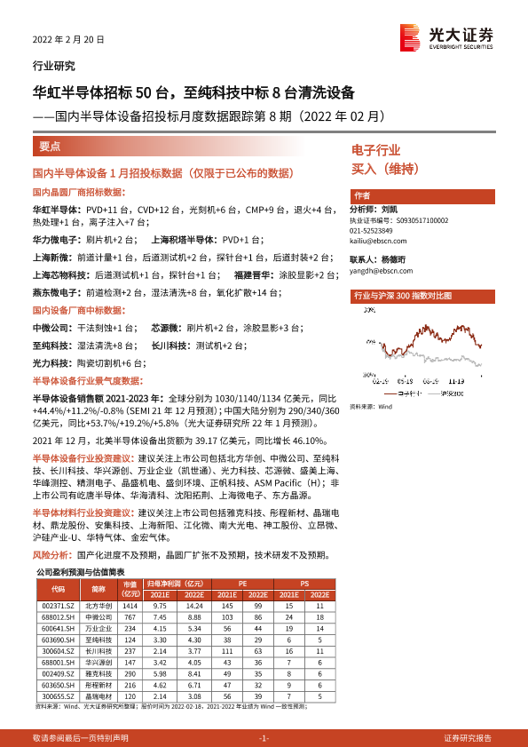 【光大证券】【20220220】国内半导体设备招投标月度数据跟踪第8期(2022年02月):华虹半导体招标50台,至纯科技中标8台清洗设备-18页