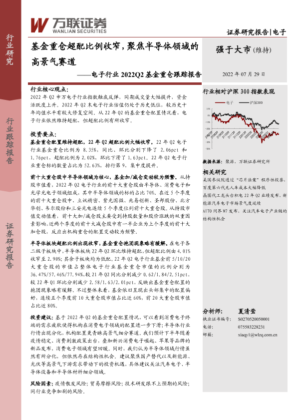 【万联证券】【20220729】电子行业2022Q2基金重仓跟踪报告:基金重仓超配比例收窄,聚焦半导体领域的高景气赛道-11页