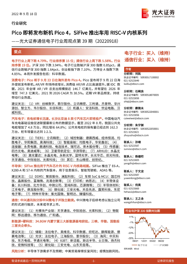 【光大证券】【20220918】20220918-光大证券-通信电子行业周观点第39期:Pico即将发布新机Pico4,SiFive推出车用RISC-V内核系列-14页