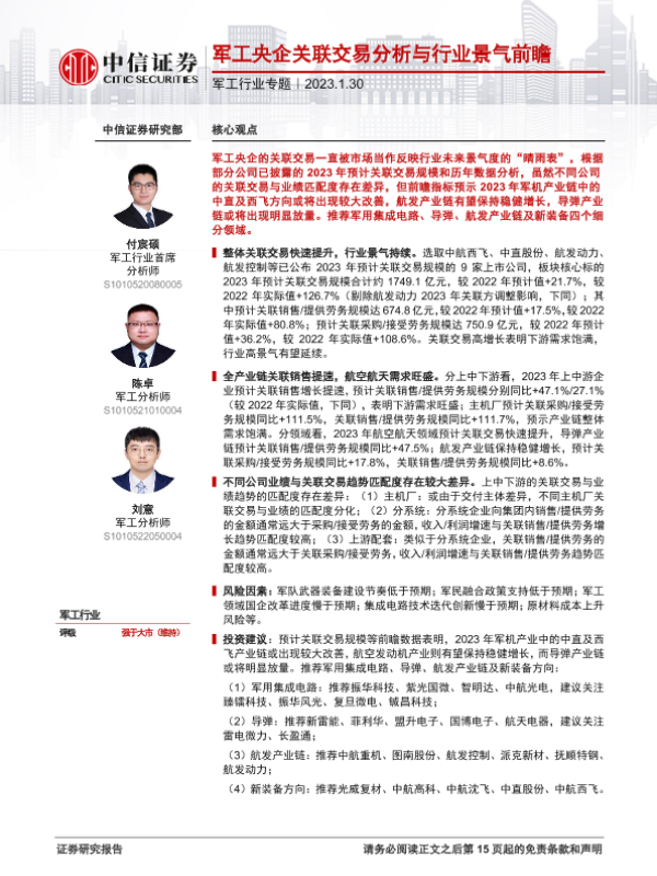 【中信证券】【20230130】军工行业专题:军工央企关联交易分析与行业景气前瞻-16页