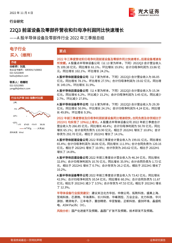 【光大证券】【20221104】A股半导体设备及零部件行业2022年三季报总结:22Q3前道设备及零部件营收和归母净利润同比快速增长-10页