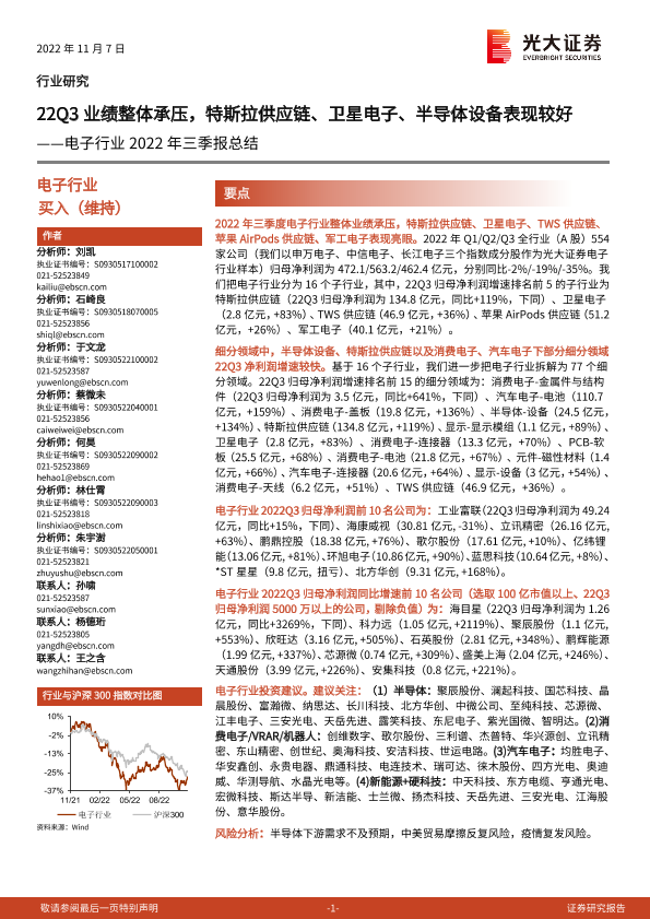 【光大证券】【20221107】电子行业2022年三季报总结:22Q3业绩整体承压,特斯拉供应链、卫星电子、半导体设备表现较好-10页