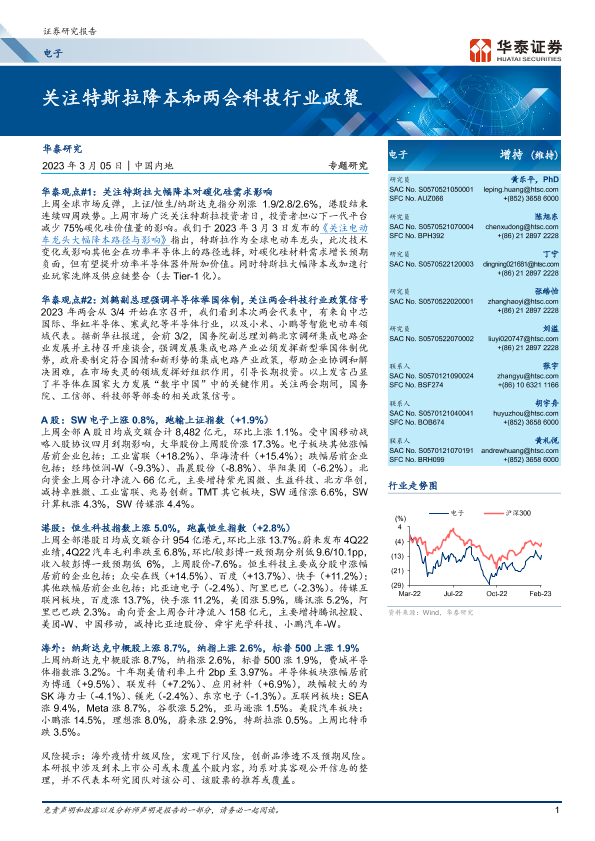 【华泰证券】【20230305】电子专题研究:关注特斯拉降本和两会科技行业政策-26页