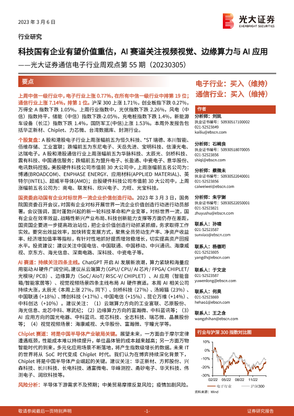 【光大证券】【20230306】20230306-光大证券-通信电子行业周观点第55期:科技国有企业有望价值重估,AI赛道关注视频视觉、边缘算力与AI应用-18页
