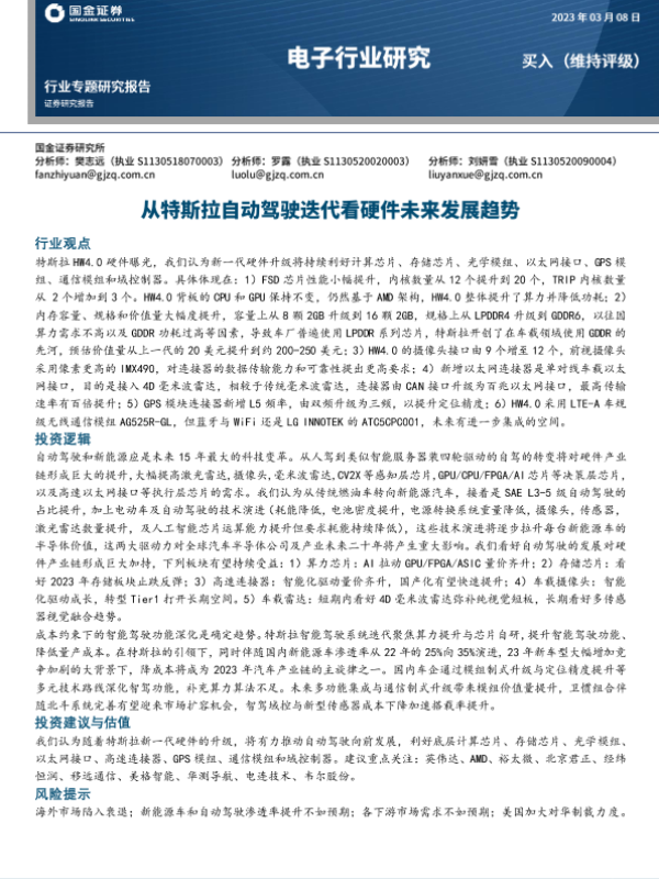 【国金证券】【20230308】20230308-国金证券-电子行业研究:从特斯拉自动驾驶迭代看硬件未来发展趋势-26页