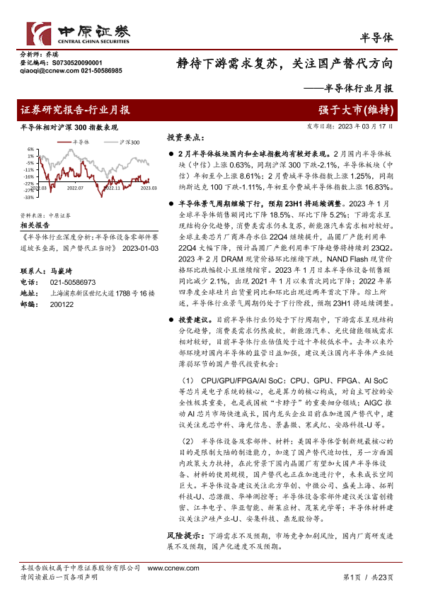 【中原证券】【20230317】20230317-中原证券-半导体行业月报:静待下游需求复苏,关注国产替代方向-23页