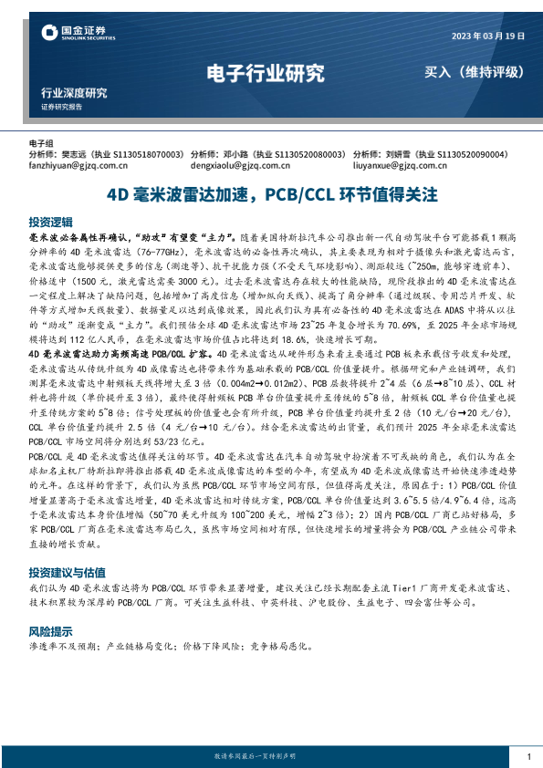 【国金证券】【20230319】20230319-国金证券-电子行业研究:4D毫米波雷达加速,PCB CCL环节值得关注-19页