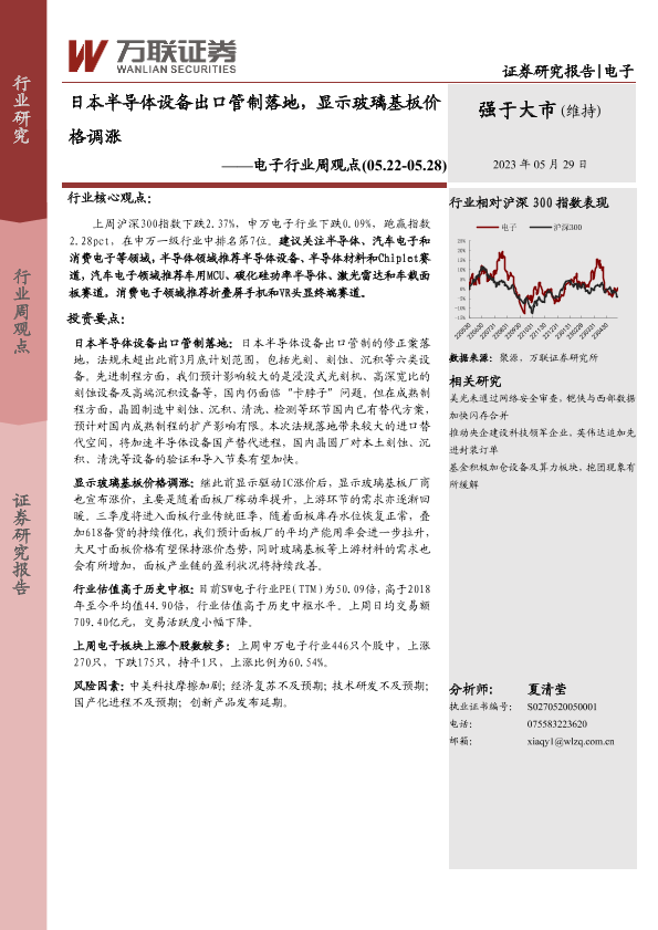 【万联证券】【20230529】20230529-万联证券-电子行业周观点:日本半导体设备出口管制落地,显示玻璃基板价格调涨-15页