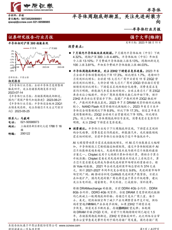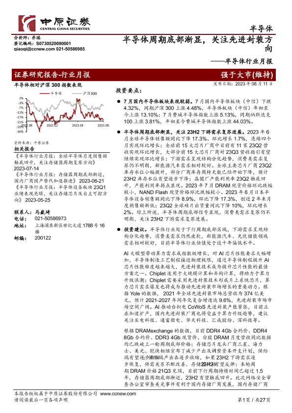 【中原证券】【20230811】20230811-中原证券-半导体行业月报:半导体周期底部渐显,关注先进封装方向-27页