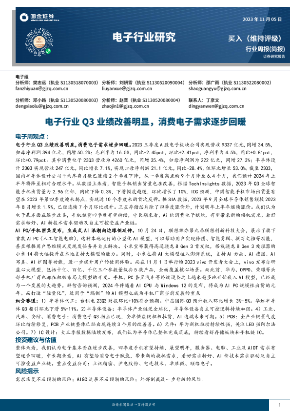 【国金证券】【20231105】电子行业Q3业绩改善明显,消费电子需求逐步回暖-13页