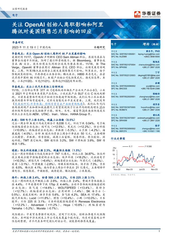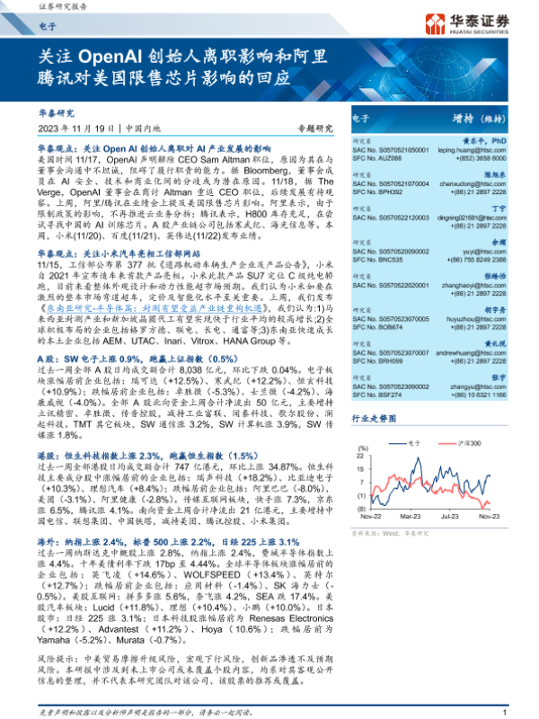 【华泰证券】【20231119】20231119-华泰证券-电子专题研究:关注OpenAI创始人离职影响和阿里腾讯对美国限售芯片影响的回应-42页