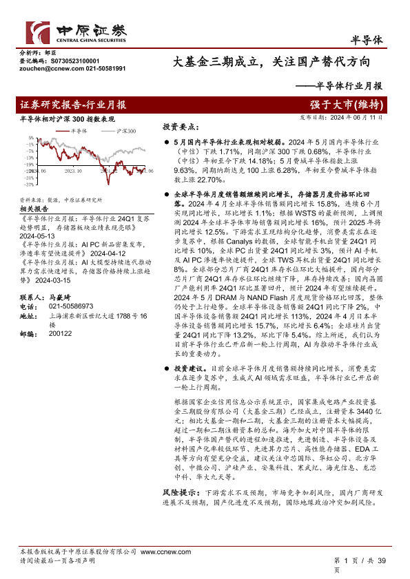 【中原证券】【20240611】20240611-中原证券-半导体行业月报:大基金三期成立,关注国产替代方向-39页