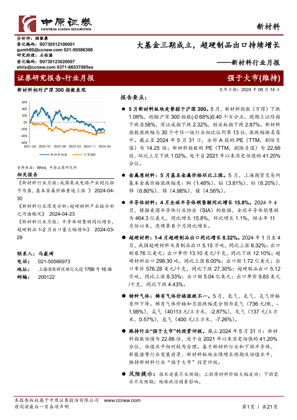 【中原证券】【20240614】20240614-中原证券-新材料行业月报:大基金三期成立,超硬制品出口持续增长-21页