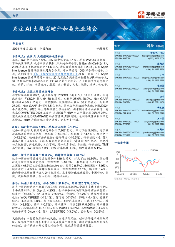 【华泰证券】【20240623】20240623-华泰证券-电子专题研究:关注AI大模型硬件和美光业绩会-45页