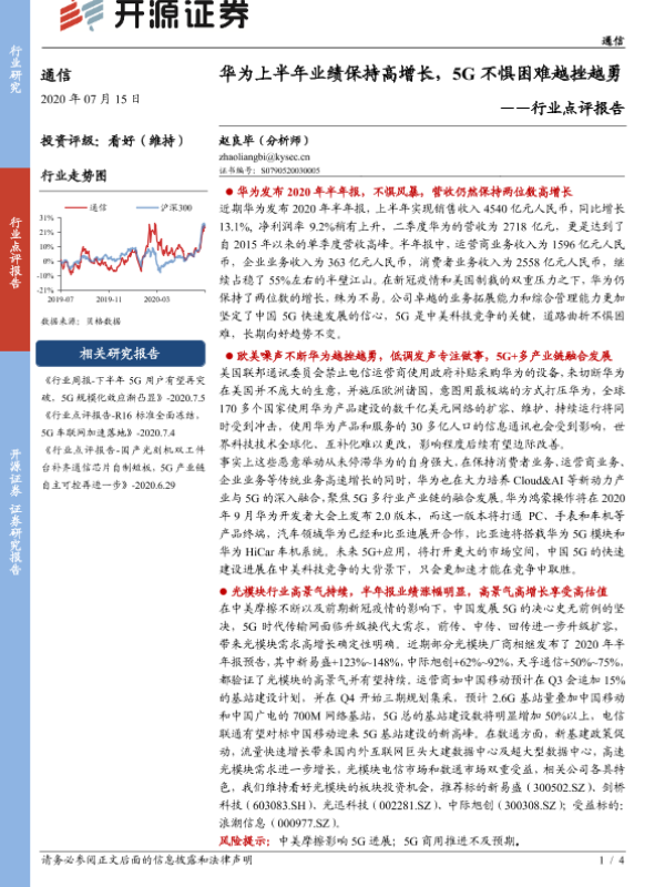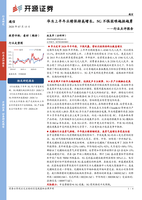 【开源证券】【20200715】20200715-开源证券-通信行业点评报告:华为上半年业绩保持高增长,5G不惧困难越挫越勇-4页