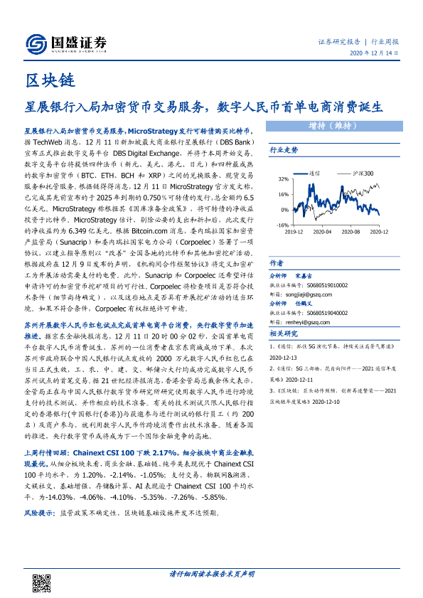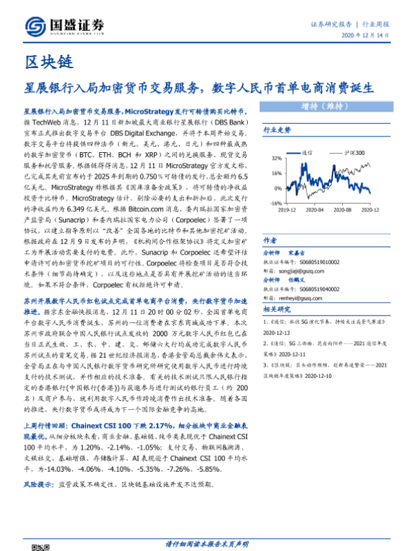 【国盛证券】【20201214】区块链行业周报:星展银行入局加密货币交易服务,数字人民币首单电商消费诞生-8页