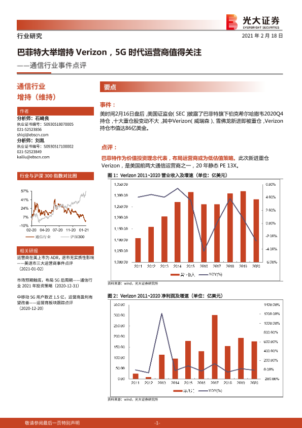 【光大证券】【20210218】20210218-光大证券-通信行业事件点评:巴菲特大举增持Verizon,5G时代运营商值得关注-4页