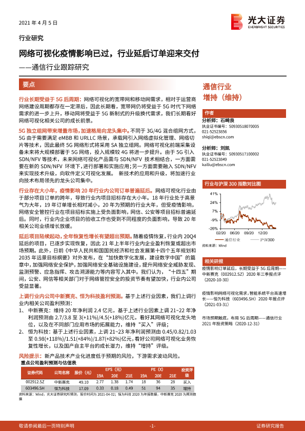 【光大证券】【20210405】通信行业跟踪研究:网络可视化疫情影响已过,行业延后订单迎来交付-2页