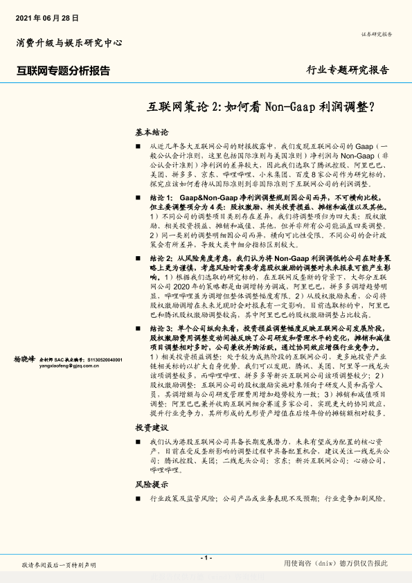 行业发展趋势 Non-Gaap利润调整 财报分析 股权投资 互联网公司