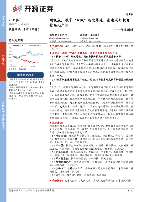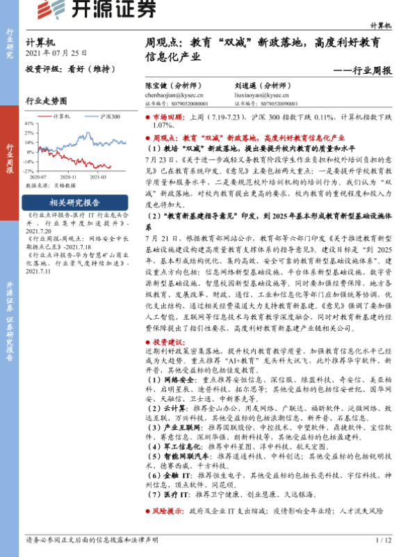 【开源证券】【20210725】20210725-开源证券-计算机行业周报:教育“双减”新政落地,高度利好教育信息化产业-12页
