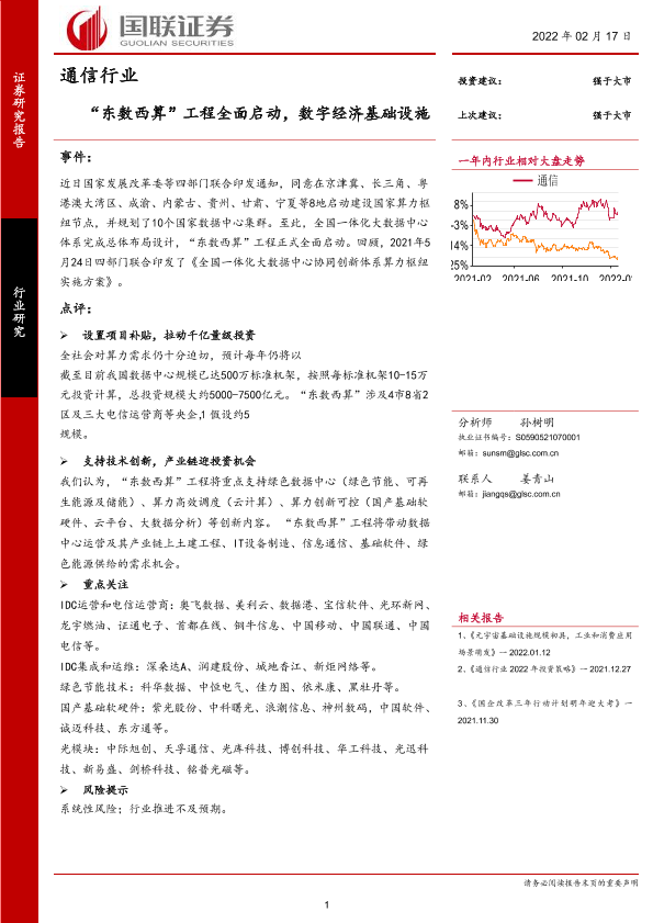 【国联证券】【20220217】通信行业:“东数西算”工程全面启动,数字经济基础设施迎契机-3页