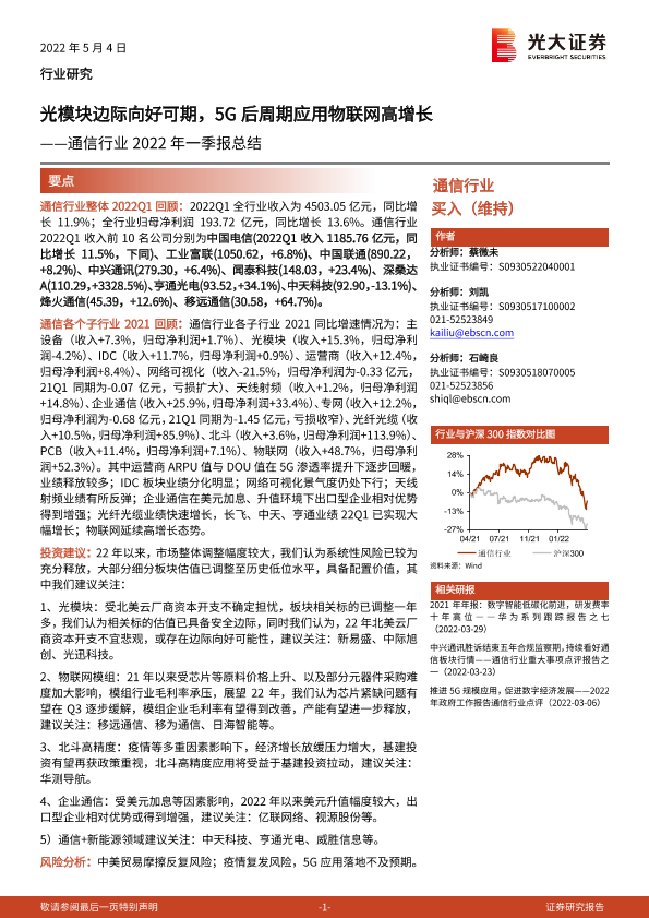 【光大证券】【20220504】通信行业2022年一季报总结:光模块边际向好可期,5G后周期应用物联网高增长-13页