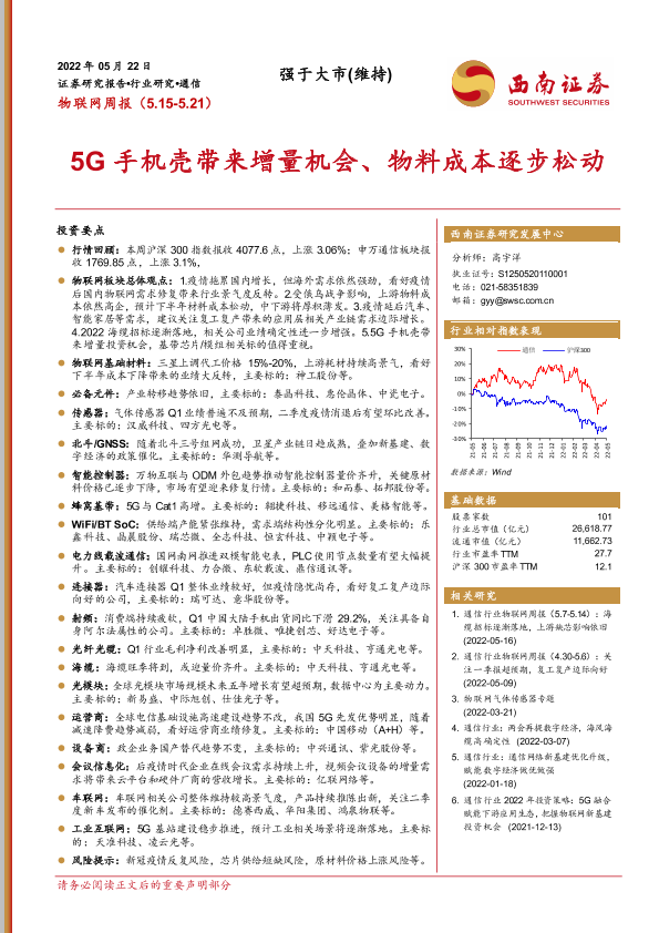 【西南证券】【20220522】物联网周报:5G手机壳带来增量机会、物料成本逐步松动-19页