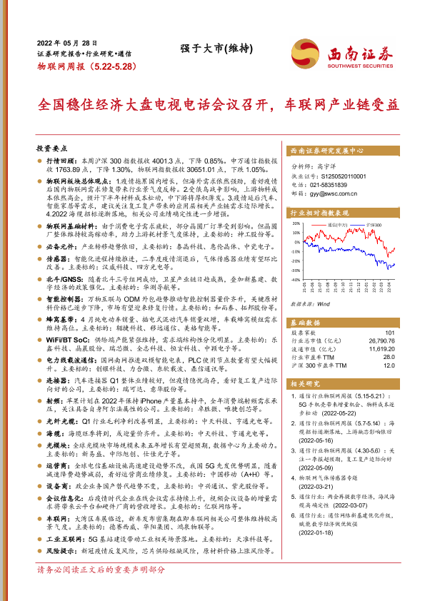 【西南证券】【20220528】物联网周报:全国稳住经济大盘电视电话会议召开,车联网产业链受益-20页