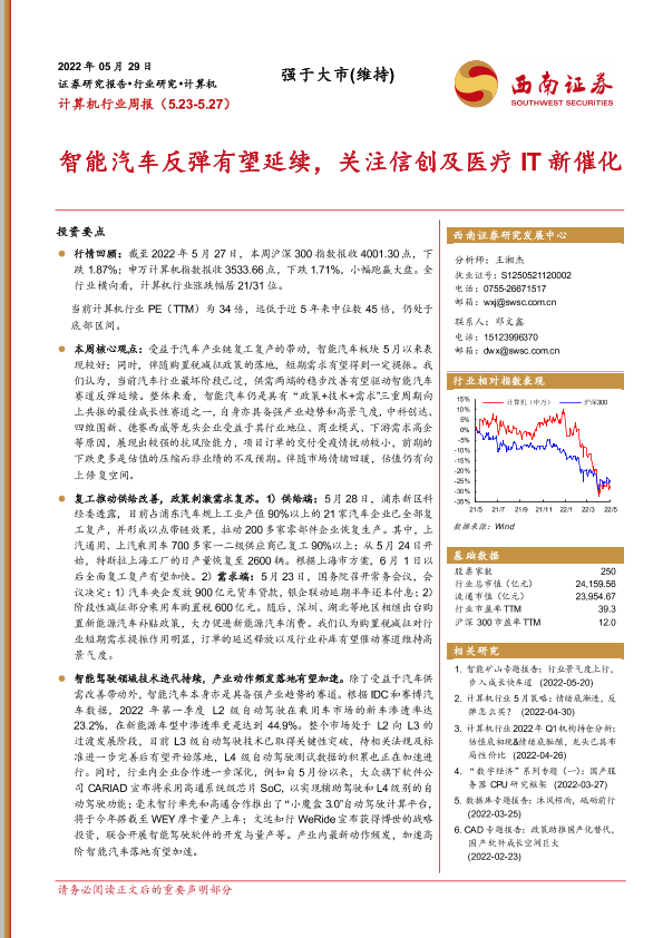 【西南证券】【20220529】20220529-西南证券-计算机行业周报:智能汽车反弹有望延续,关注信创及医疗IT新催化-29页