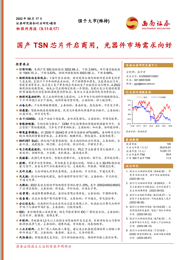 【西南证券】【20220917】20220917-西南证券-物联网周报:国产TSN芯片开启商用,光器件市场需求向好-19页