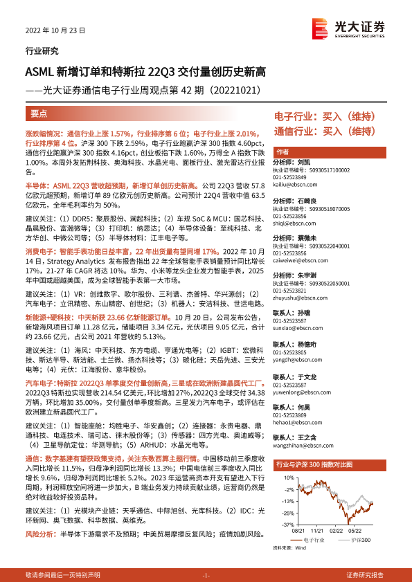 【光大证券】【20221023】20221023-光大证券-通信电子行业周观点第42期:ASML新增订单和特斯拉22Q3交付量创历史新高-18页