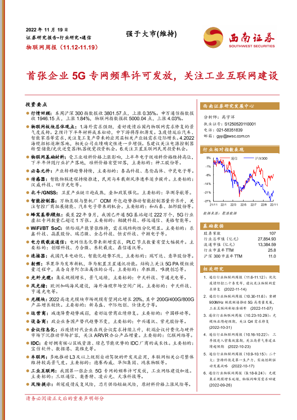 【西南证券】【20221119】物联网周报:首张企业5G专网频率许可发放,关注工业互联网建设-22页