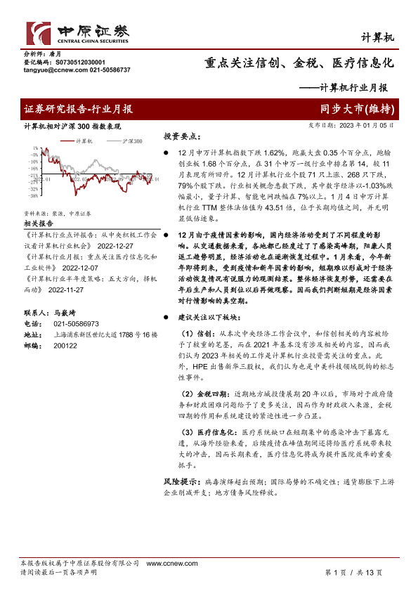 【中原证券】【20230105】计算机行业月报:重点关注信创、金税、医疗信息化-13页