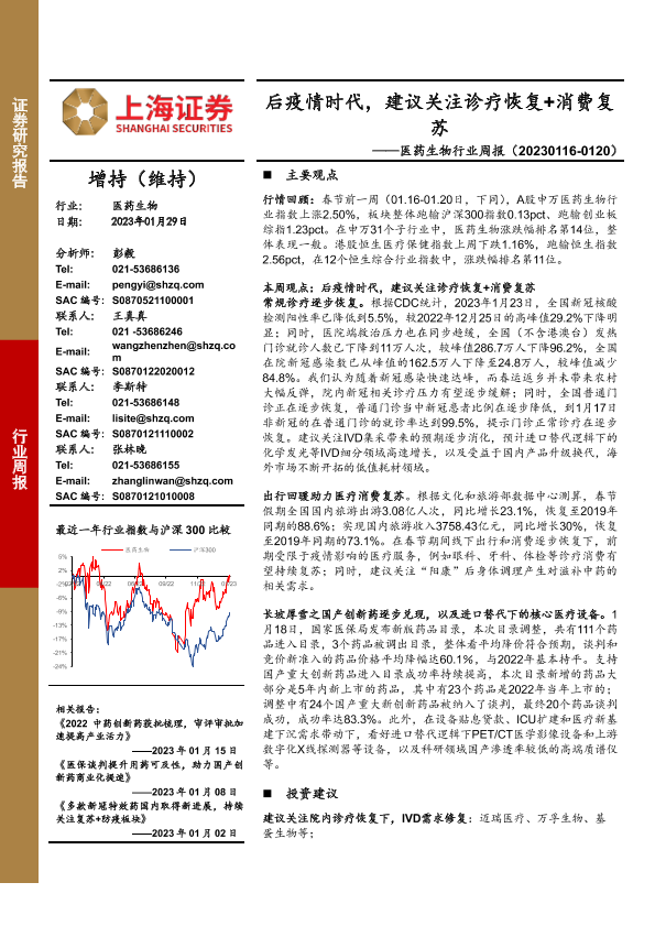 【上海证券】【20230129】医药生物行业周报:后疫情时代,建议关注诊疗恢复+消费复苏-25页