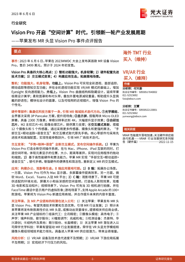 【光大证券】【20230606】苹果发布MR头显Vision Pro事件点评报告:Vision Pro开启“空间计算”时代,引领新一轮产业发展周期-15页