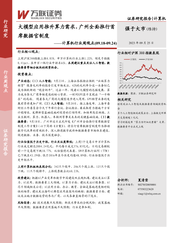 【万联证券】【20230925】20230925-万联证券-计算机行业周观点:大模型应用推升算力需求,广州全面推行首席数据官制度-10页
