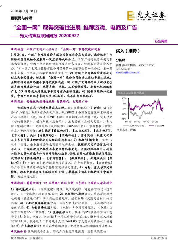 【光大证券】【20200928】20200928-光大证券-光大传媒互联网周报:“全国一网”取得突破性进展 推荐游戏、电商及广告-14页