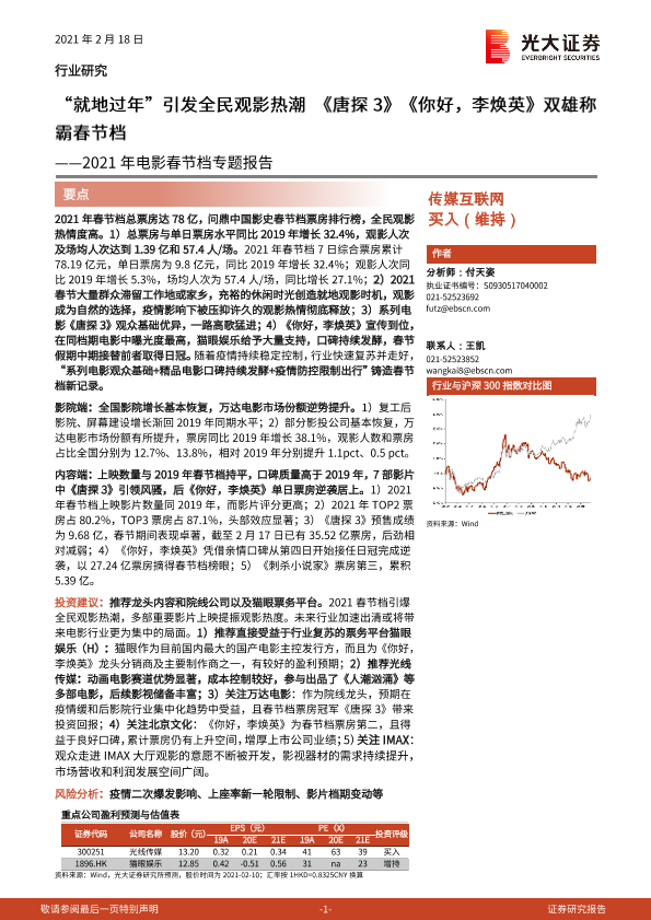 【光大证券】【20210218】2021年电影春节档专题报告:“就地过年”引发全民观影热潮 《唐探3》《你好,李焕英》双雄称霸春节档-19页