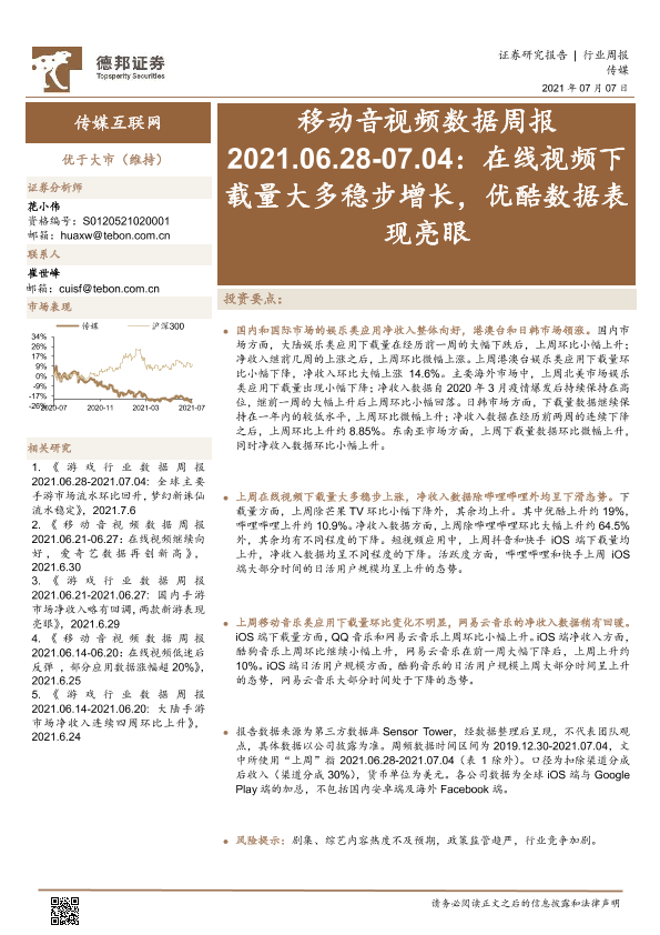 【德邦证券】【20210707】移动音视频数据周报:在线视频下载量大多稳步增长,优酷数据表现亮眼-16页