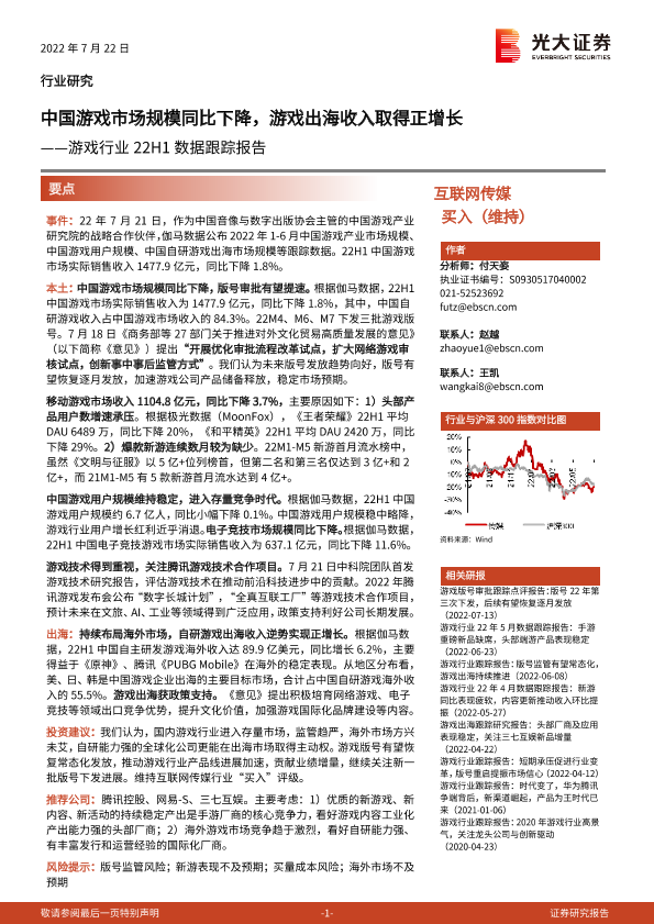 【光大证券】【20220722】游戏行业22H1数据跟踪报告:中国游戏市场规模同比下降,游戏出海收入取得正增长-2页