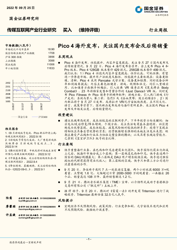 【国金证券】【20220925】20220925-国金证券-传媒互联网产业行业研究:Pico4海外发布,关注国内发布会及后续销量-20页