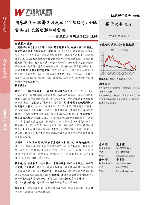【万联证券】【20240304】国家新闻出版署2月发放111款版号,全球首部AI长篇电影即将首映-12页