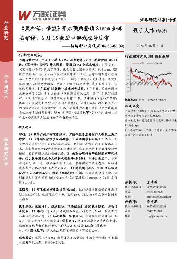 【万联证券】【20240611】《黑神话:悟空》开启预购登顶Steam全球热销榜,6月15款进口游戏版号过审-13页