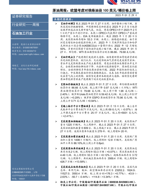 【信达证券】【20230129】原油周报:欧盟考虑对俄柴油设100美元桶价格上限-27页