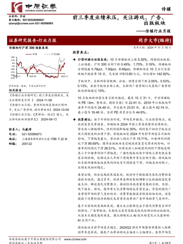 【中原证券】【20241115】20241115-中原证券-传媒行业月报:前三季度业绩承压,关注游戏、广告、出版板块-18页