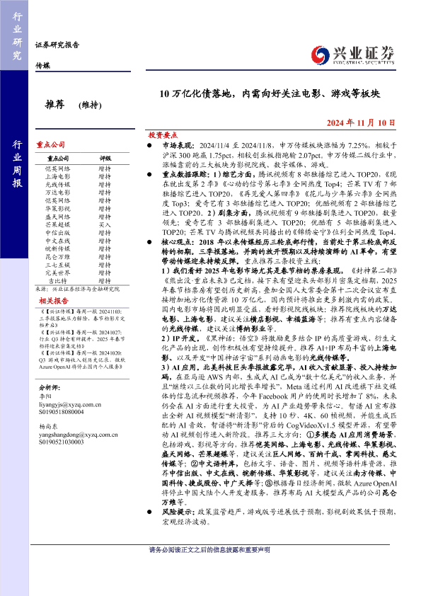 【兴业证券】【20241110】20241110-兴业证券-传媒行业周报:10万亿化债落地,内需向好关注电影、游戏等板块-13页
