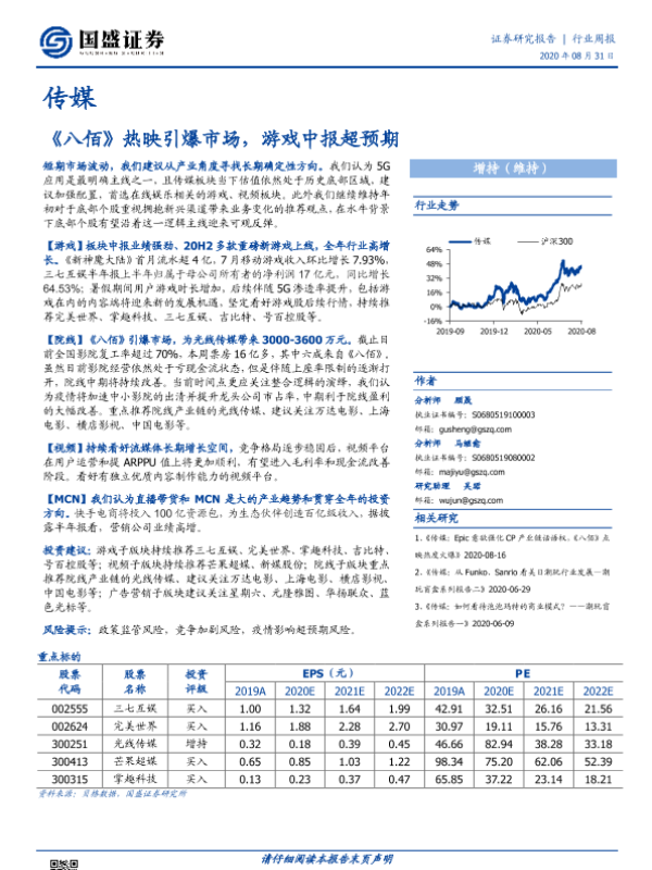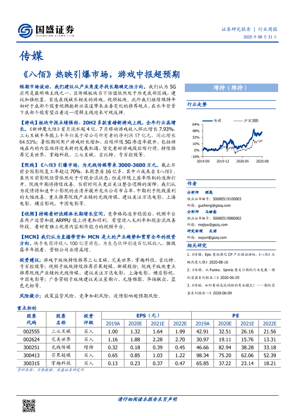【国盛证券】【20200831】20200831-国盛证券-传媒行业周报:《八佰》热映引爆市场,游戏中报超预期-17页